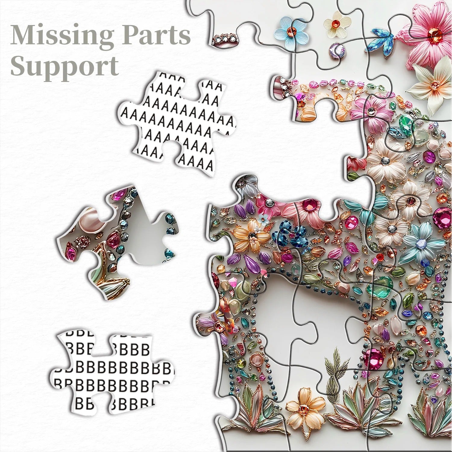 Intricate Embroidery and Jewel-Adorned Design: This puzzle showcases a beautifully detailed elephant, crafted with exquisite embroidery and adorned with shimmering jewels. The elephant's body is intricately decorated with delicate flowers and gemstones, each element thoughtfully placed to create a stunning visual masterpiece.