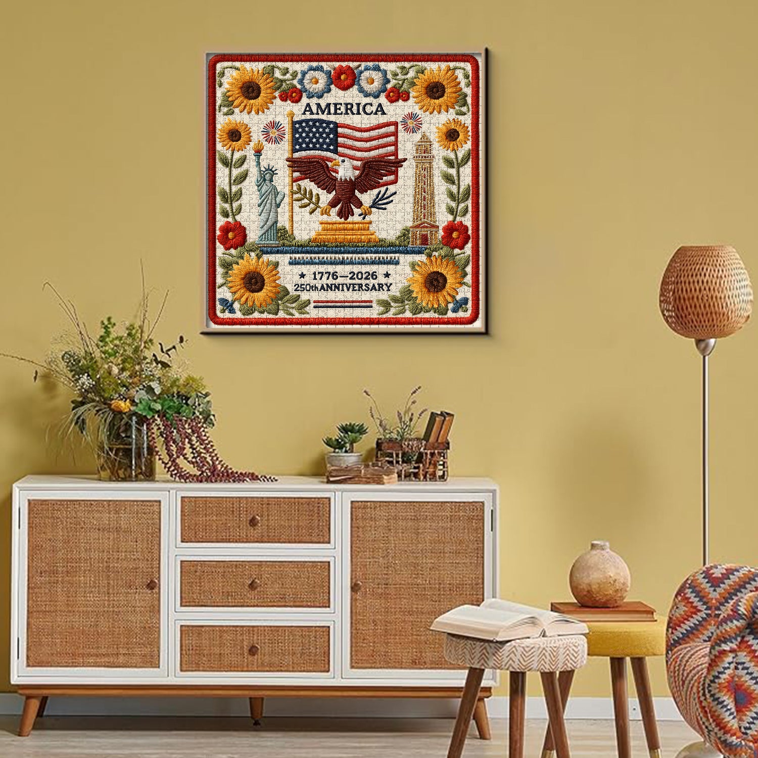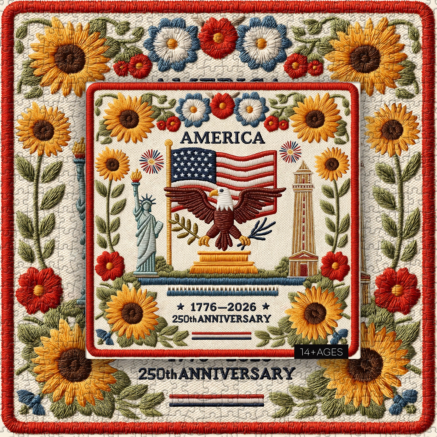 🗽🦅Stars, Stripes & Libertys: The national bird, with outstretched wings, clutches an olive branch and arrows, its back fluttering with the Stars and Stripes—a dual symbol of peace and strength, the core of the entire painting. On the left, the Statue of Liberty holds aloft its torch, while on the right, the spire of the Capitol rises majestically. Golden sunflowers surround the four corners, adorned with red, blue, and white daisies, and fireworks bloom on either side.🌻🧵