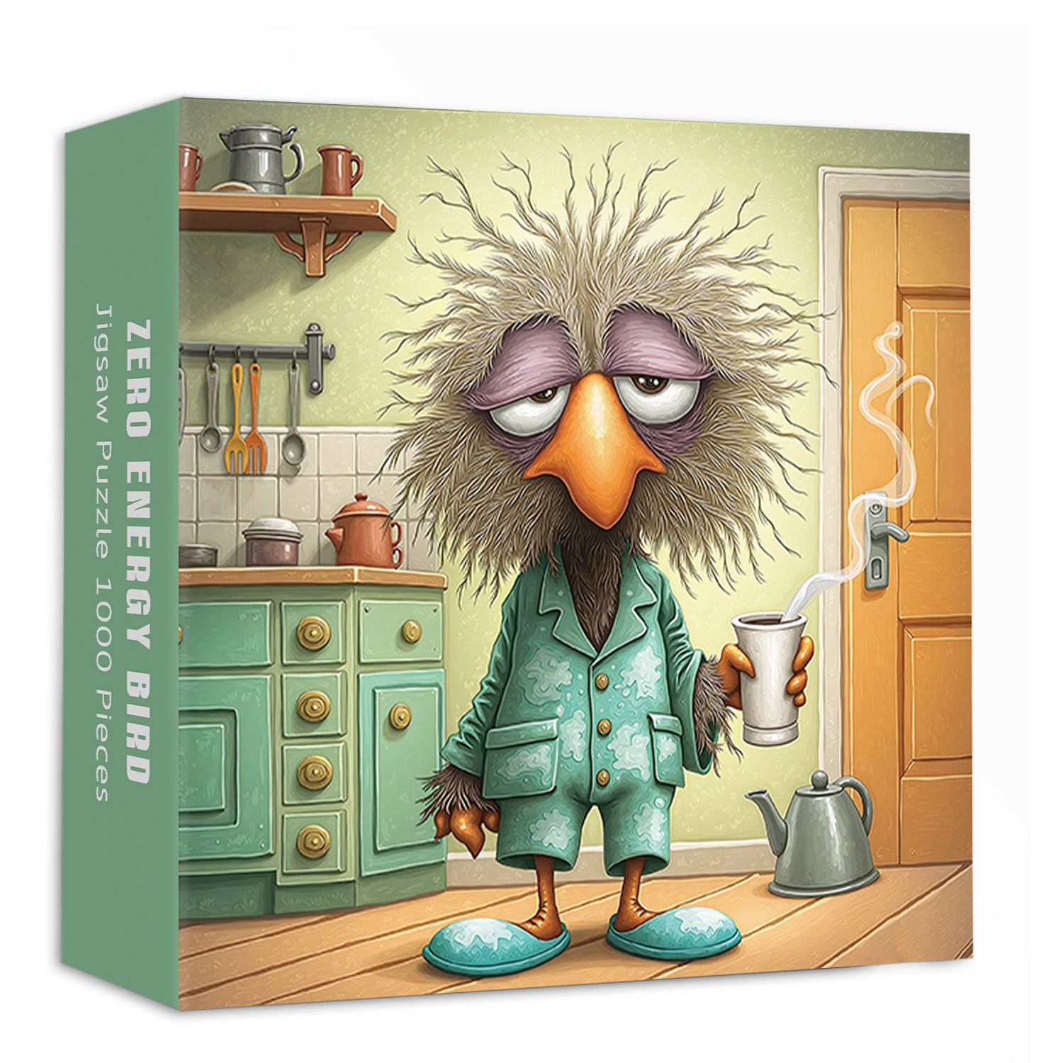 🐦Zero Energy Bird: This puzzle features a strange bird dressed in human clothing, standing in the kitchen with a steaming cup of coffee. The bird, dressed in green pajamas, stands in the warmly decorated kitchen, looking tired. It creates a playful atmosphere.🥼☕