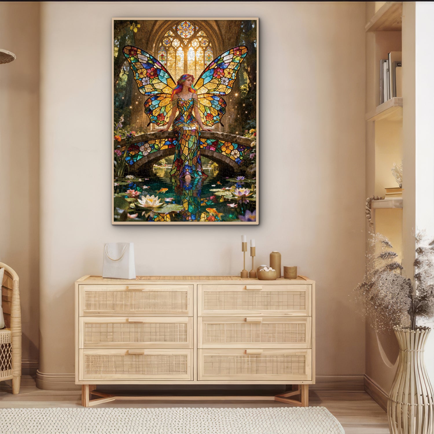 【Prism FairyA fairy sits serenely on an arched bridge, her wings as vibrant as stained glass, casting shadows on the water and among the flowers, creating a scene resembling a secret garden under a spell. Inspired by stained glass windows in churches, the colors are translucent and brilliant, with rich details in the flowers, wings, and reflections in the water. The process of assembling the puzzle feels like "pieced together a beam of light."