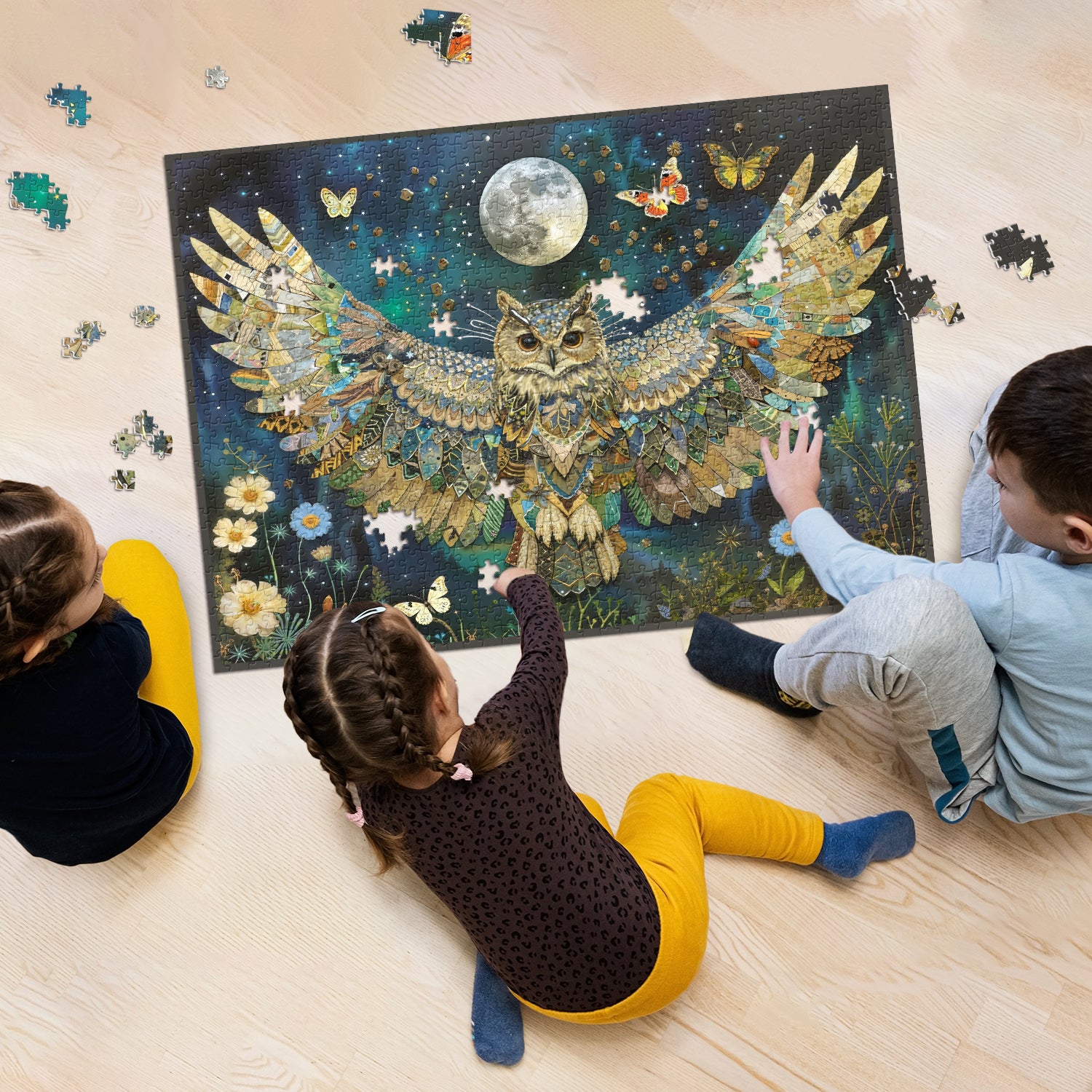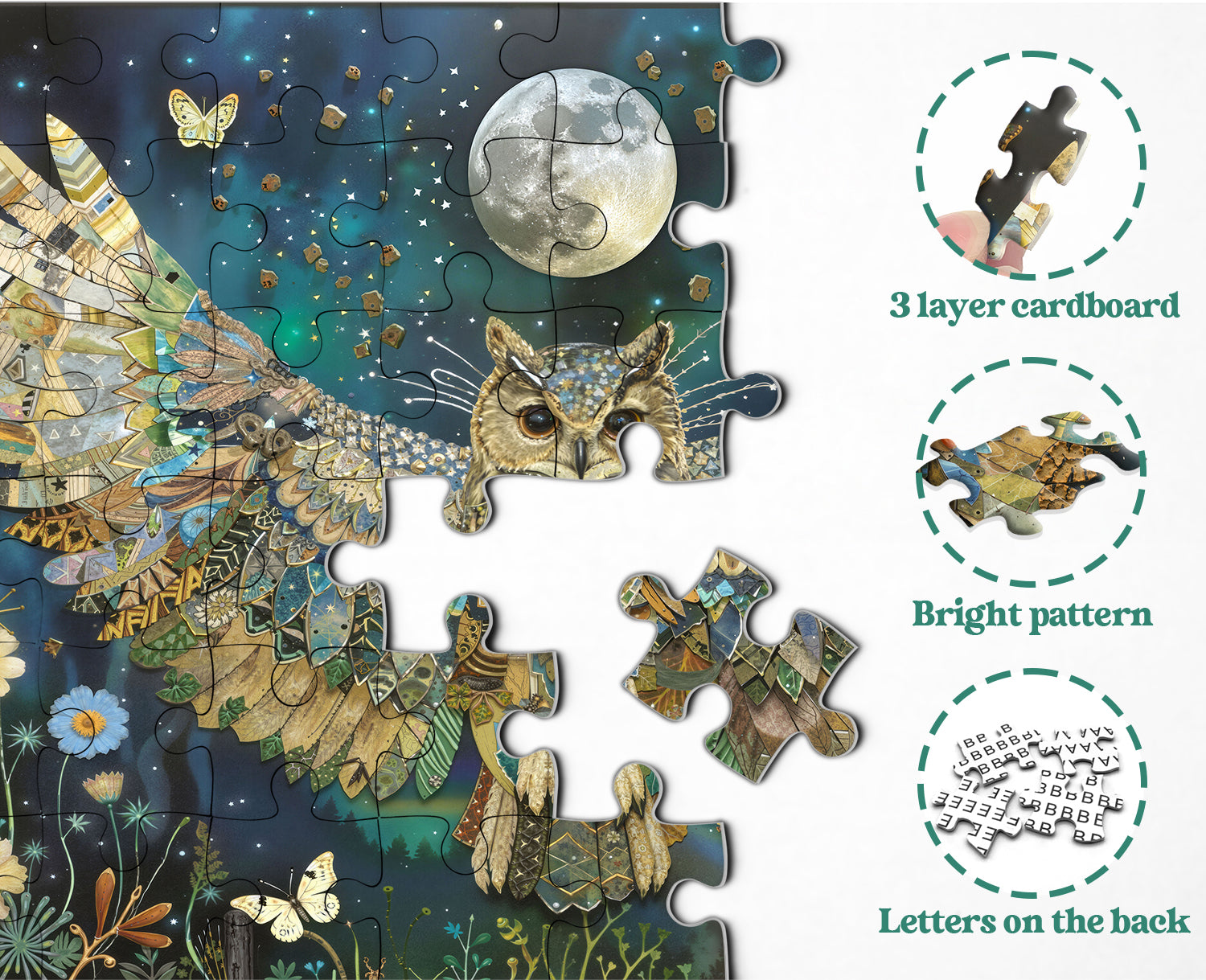 🦉【Starry Night Dreamweaver】: This jigsaw puzzle features a fantastical starry sky owl theme: the feathers are composed of retro patterns and natural textures, paired with elements of a full moon, starry night, aurora borealis, and butterflies among flowers, creating an overall fairytale-like artistic feel.🌼🍂
