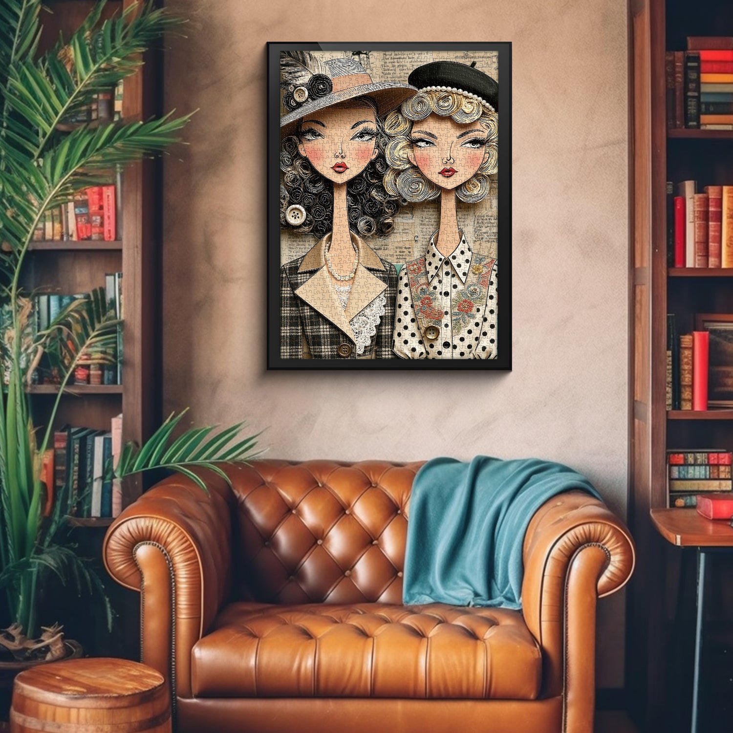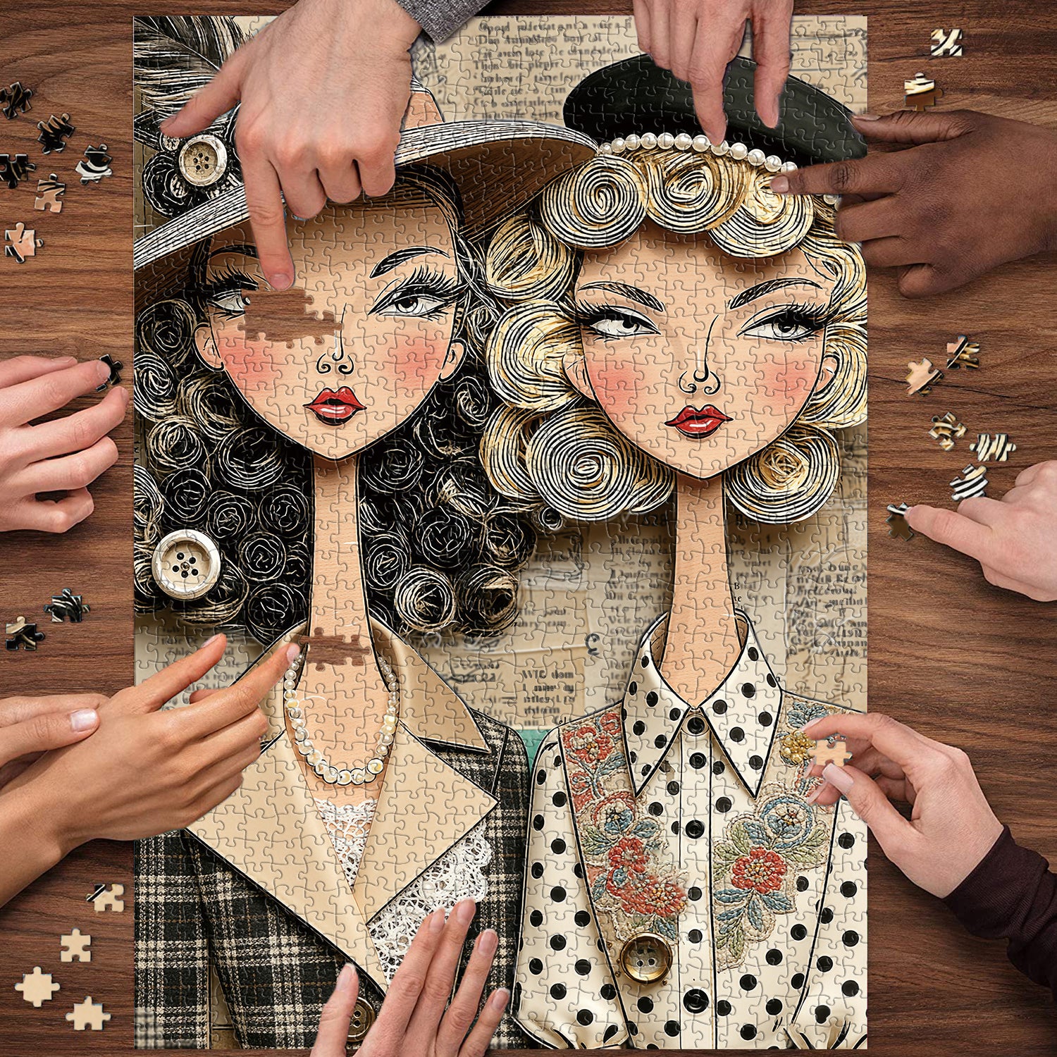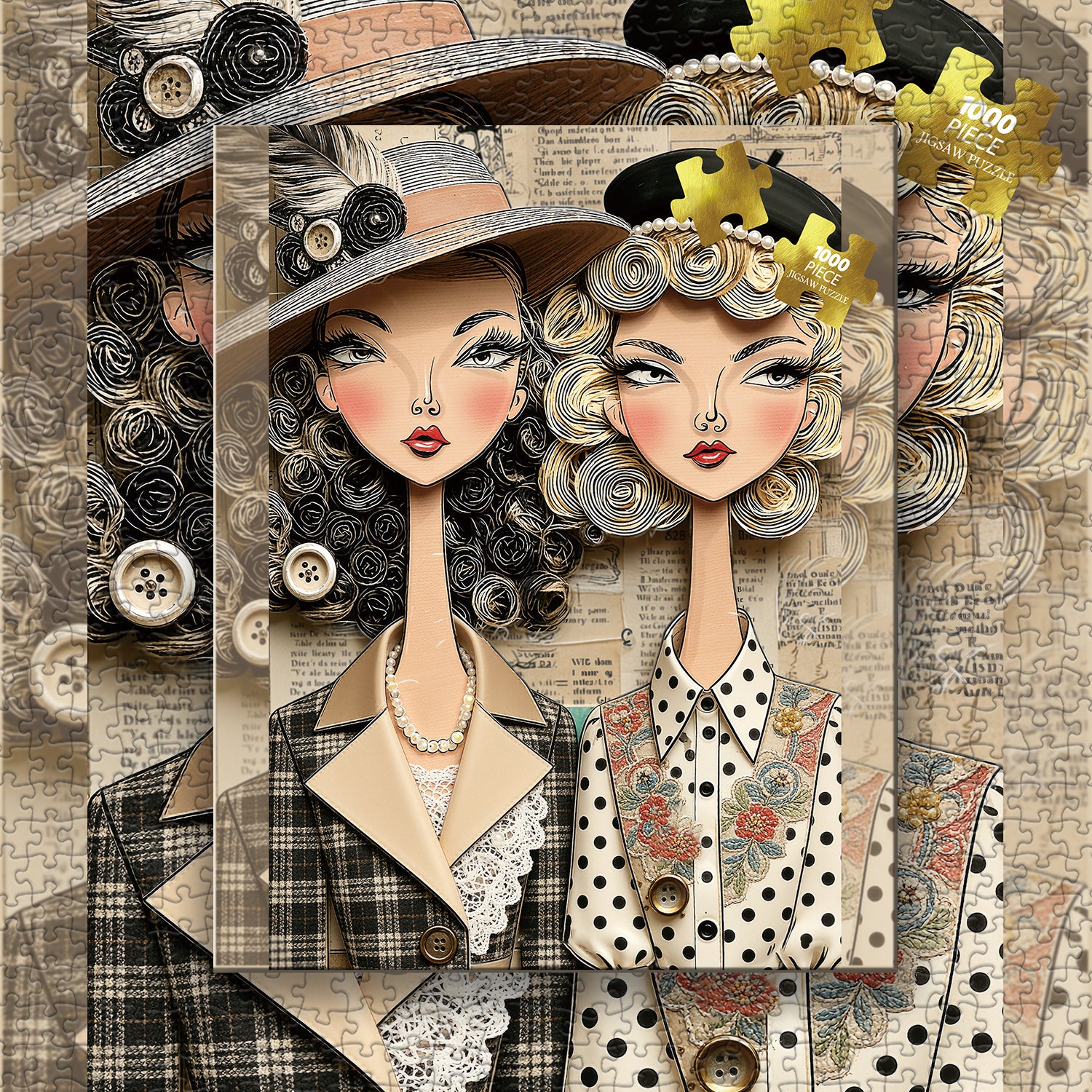 👩👒【Fashionable WomenThis retro best friend magazine puzzle presents a French retro style: two modern women stand side by side. One wears a wide-brimmed hat with feather buttons, a plaid suit, and a lace top; the other wears a black pearl hat and a polka-dot embroidered shirt, their hair styled in delicate spiral curls. The yellowed newspaper background and overall resemblance to a 20th-century retro fashion magazine convey the warmth and style of "best friends together, elegant to the end."🌼✨