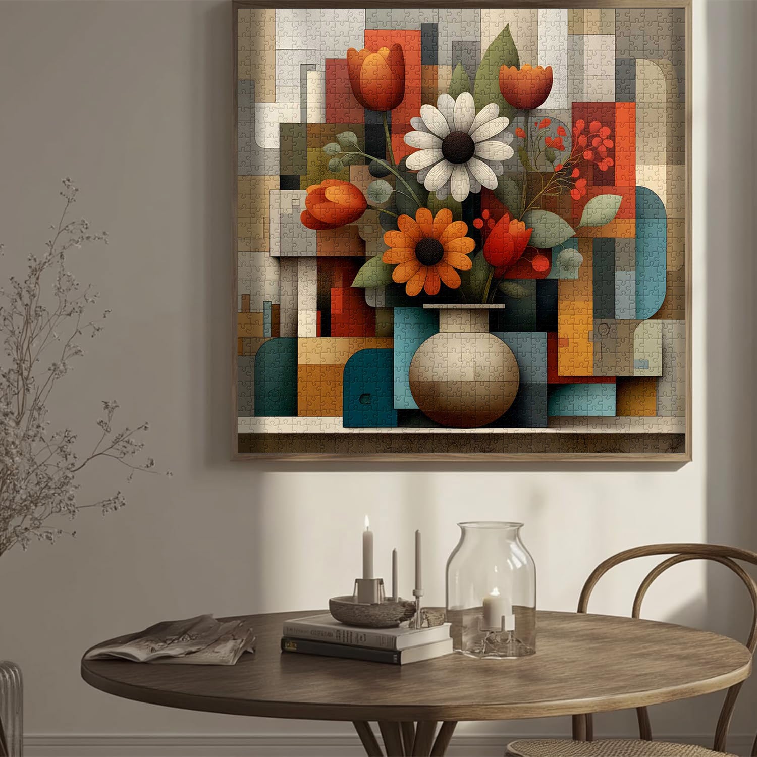 Geometric Floral Rhythm Jigsaw Puzzle: The design cleverly blends delicate flowers with rational geometry, with blocks, curves, and flowers rhythmically interwoven to create a highly designed modern art scene that is simple yet not monotonous.