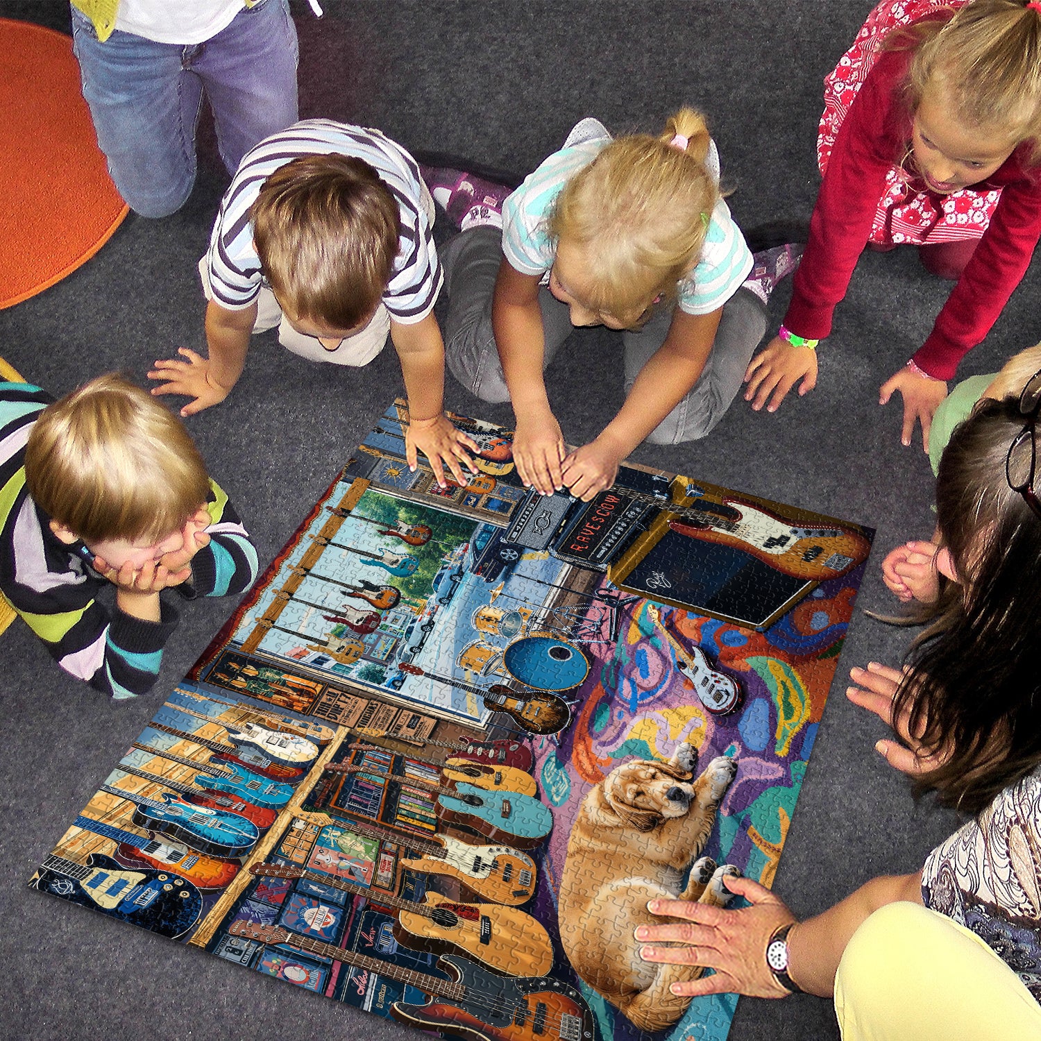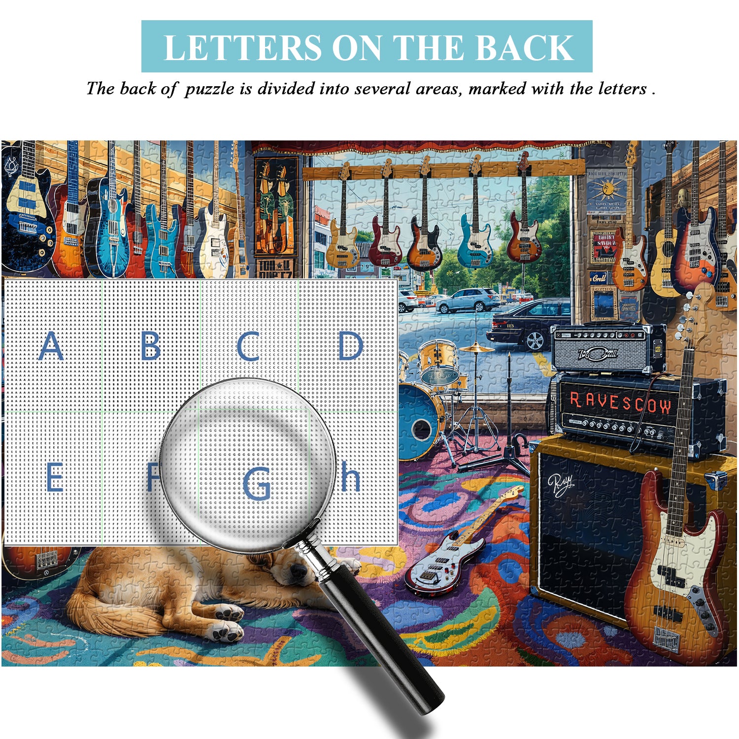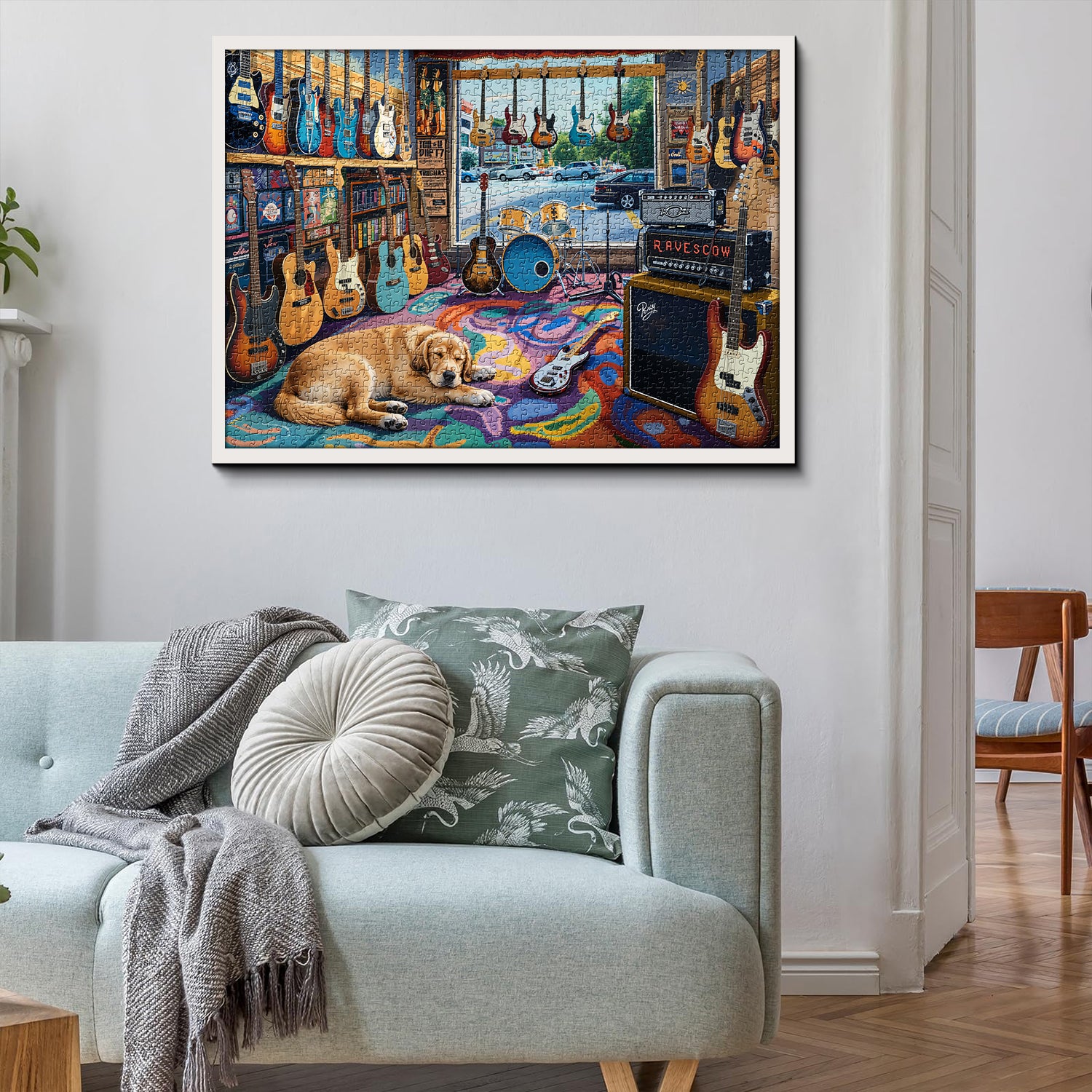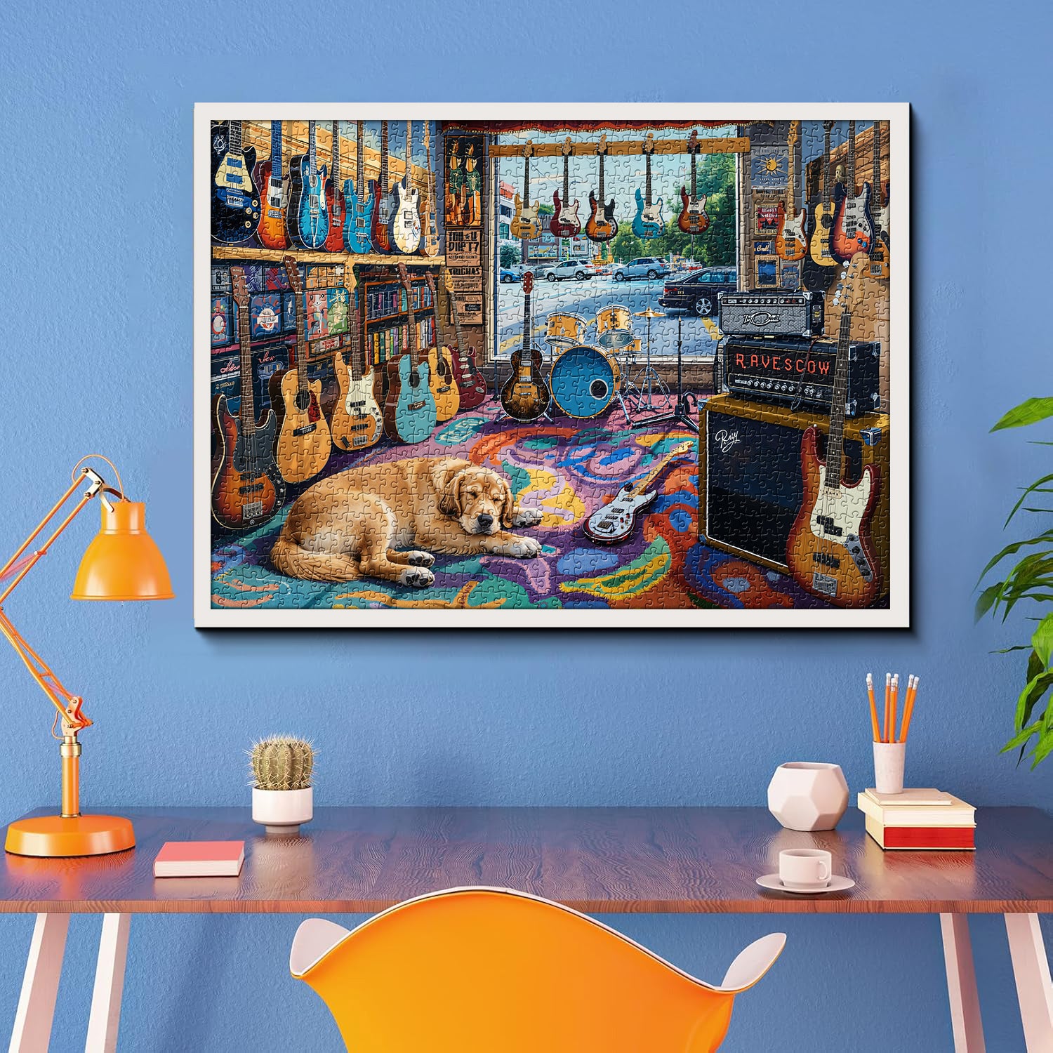 🐶🎸【Chill Music Room】: This jigsaw puzzle depicts a music store scene brimming with American retro vibes: guitars of various colors adorn the walls and shelves, drum kits, amplifiers, and record posters are arranged in a haphazard manner, and a golden retriever sleeps peacefully curled up on a colorful graffiti rug. Outside the window, a leisurely street scene unfolds, filling the room with a relaxed yet vibrant musical atmosphere.🏕️🍂