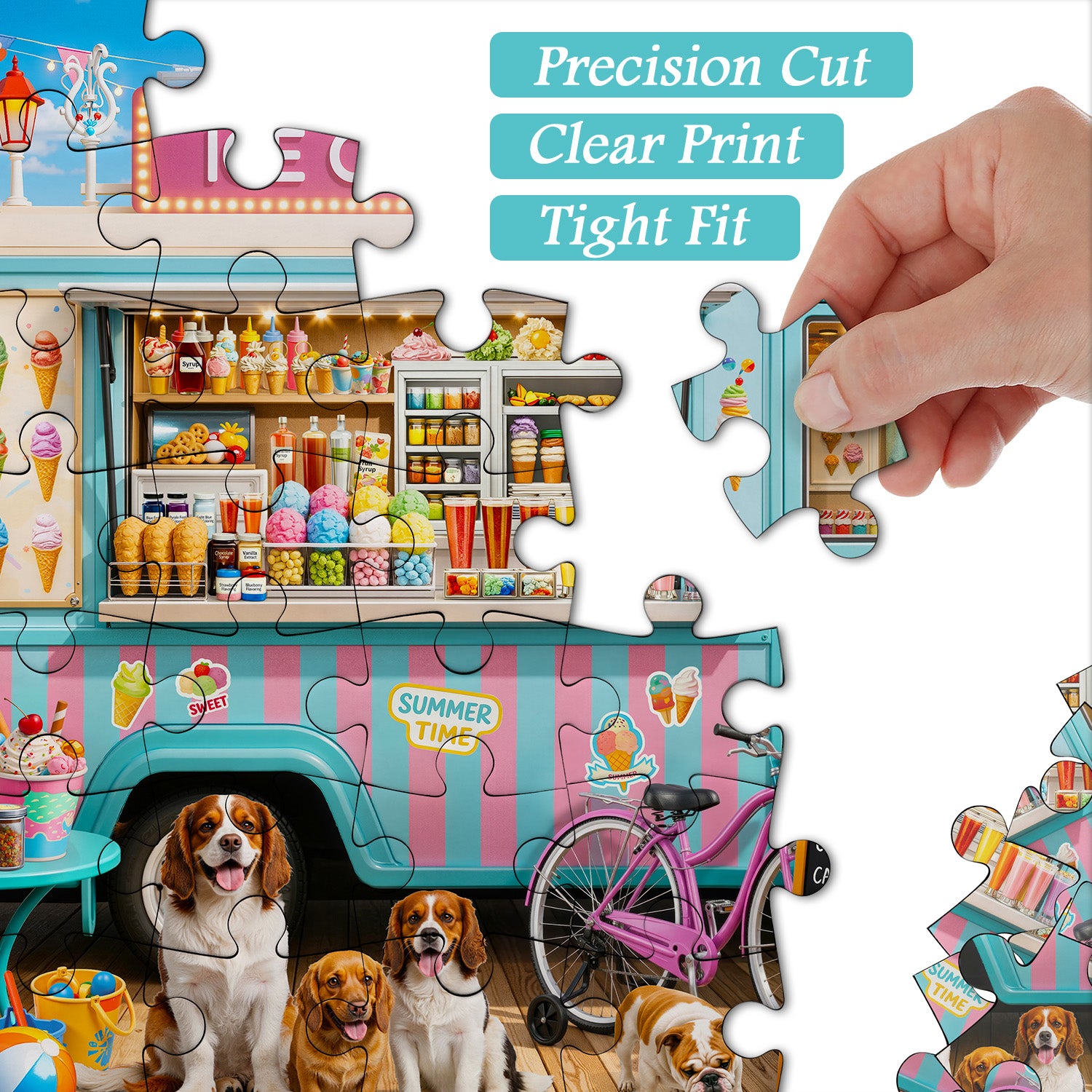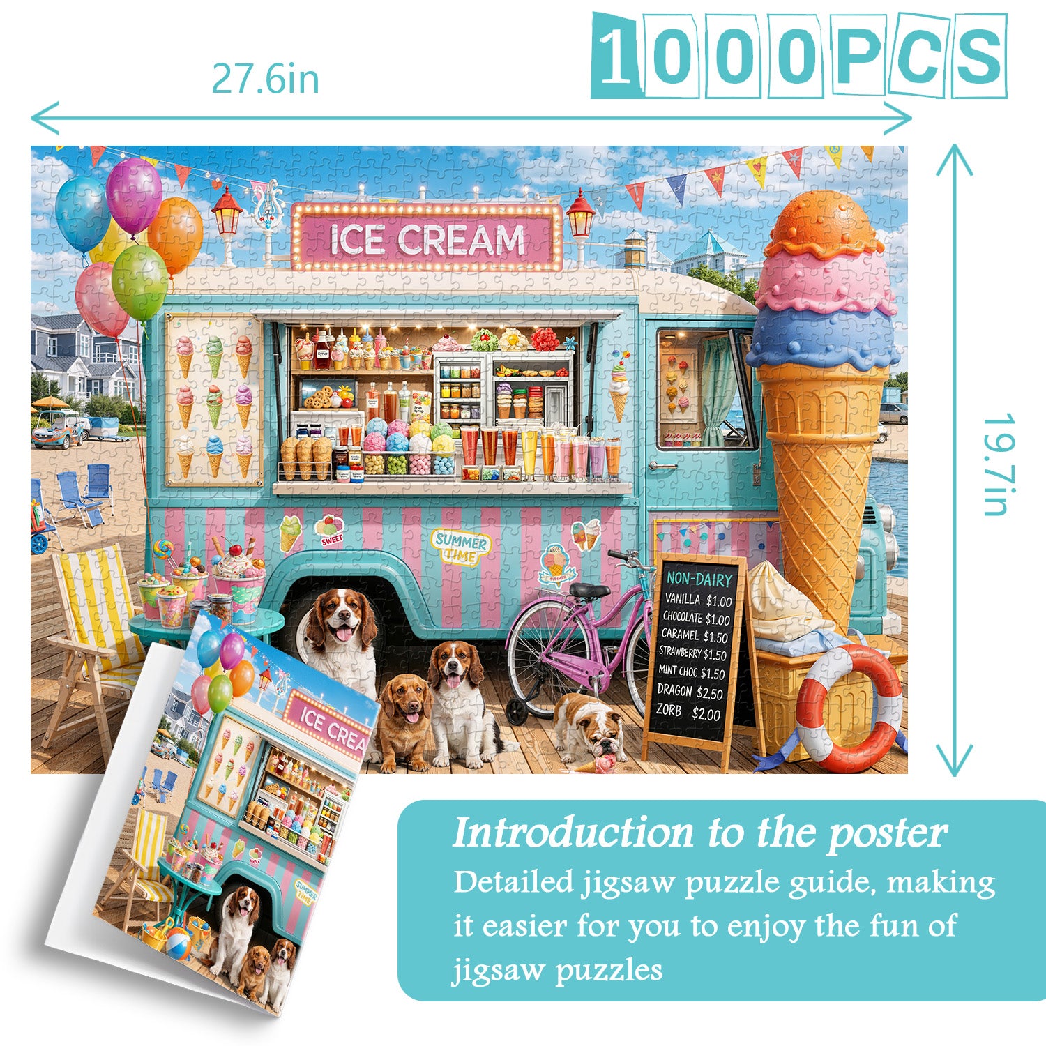 🍦🐶【Summer Scoops】: This puzzle depicts a vibrant seaside scene: a pink and blue striped ice cream truck sits on the beach, its window overflowing with colorful ice cream and drinks. Four adorable dogs surround the truck, and the surrounding area includes beach chairs, colorful balloons, a giant ice cream model, and a seaside hut, creating a sweet summer atmosphere.🏡