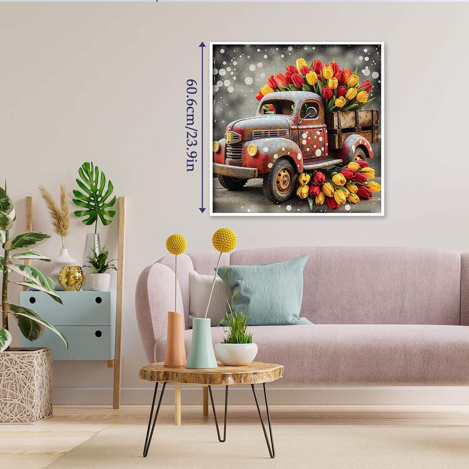 🌷🚚【Tulip TruckThis puzzle features a vintage red car, its body adorned with mottled white polka dots and rust, seemingly telling a story of bygone eras. The truck bed is filled with vibrant tulips, their red and yellow blossoms adding boundless energy and color to the scene.💐🌺