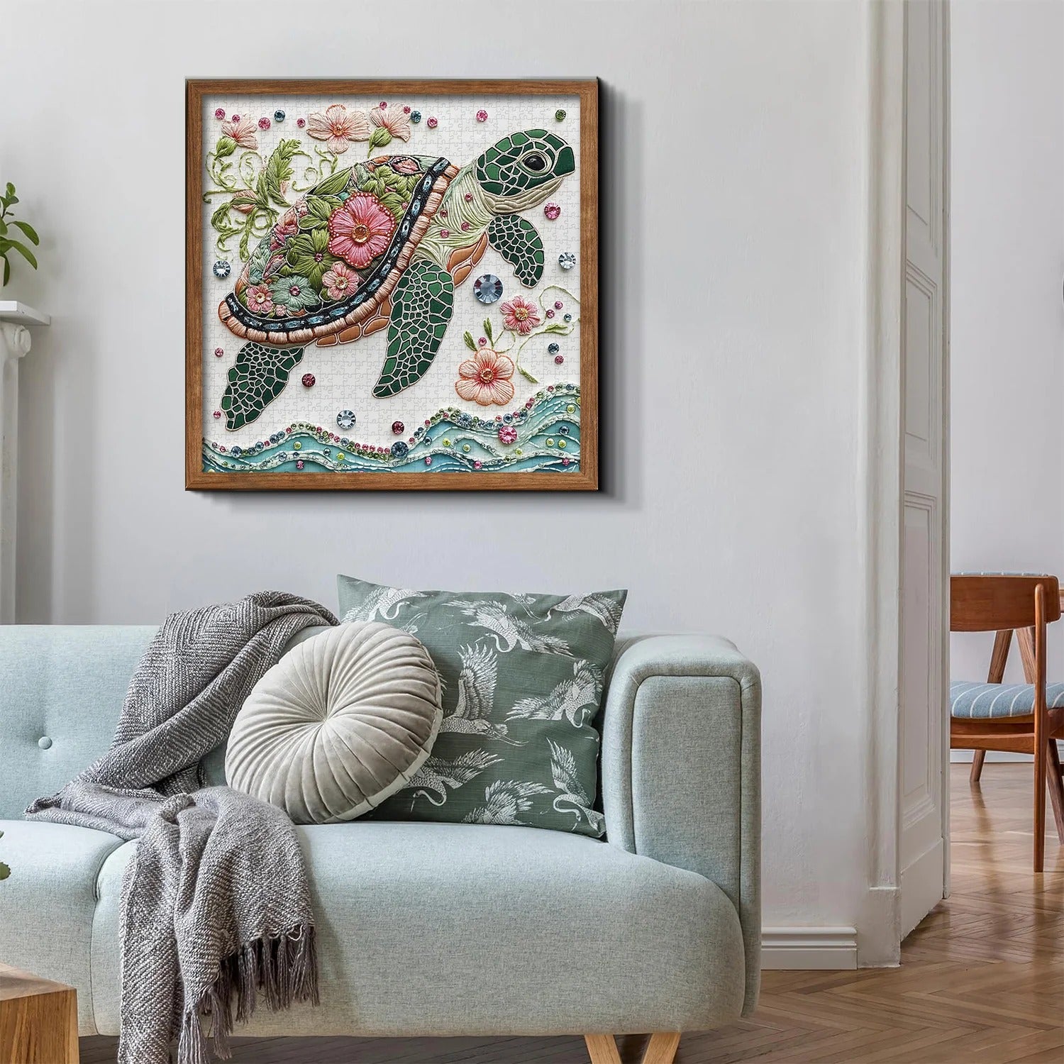 Nature Meets Elegance: The Wave Spirit Jigsaw Puzzle brings together the beauty of nature and the elegance of design. Featuring a beautiful sea turtle embroidered with floral patterns and surrounded by vivid ocean waves, this puzzle captures the essence of oceanic serenity. The turtle is encircled by colorful gemstones, adding a touch of brilliance and sophistication to the scene.